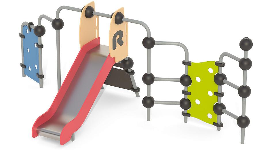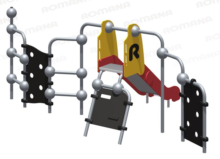 Выполнен в виде металлических стоек из 057 трубы, соединенный шарами, имеется горка h=950 мм., лазы.