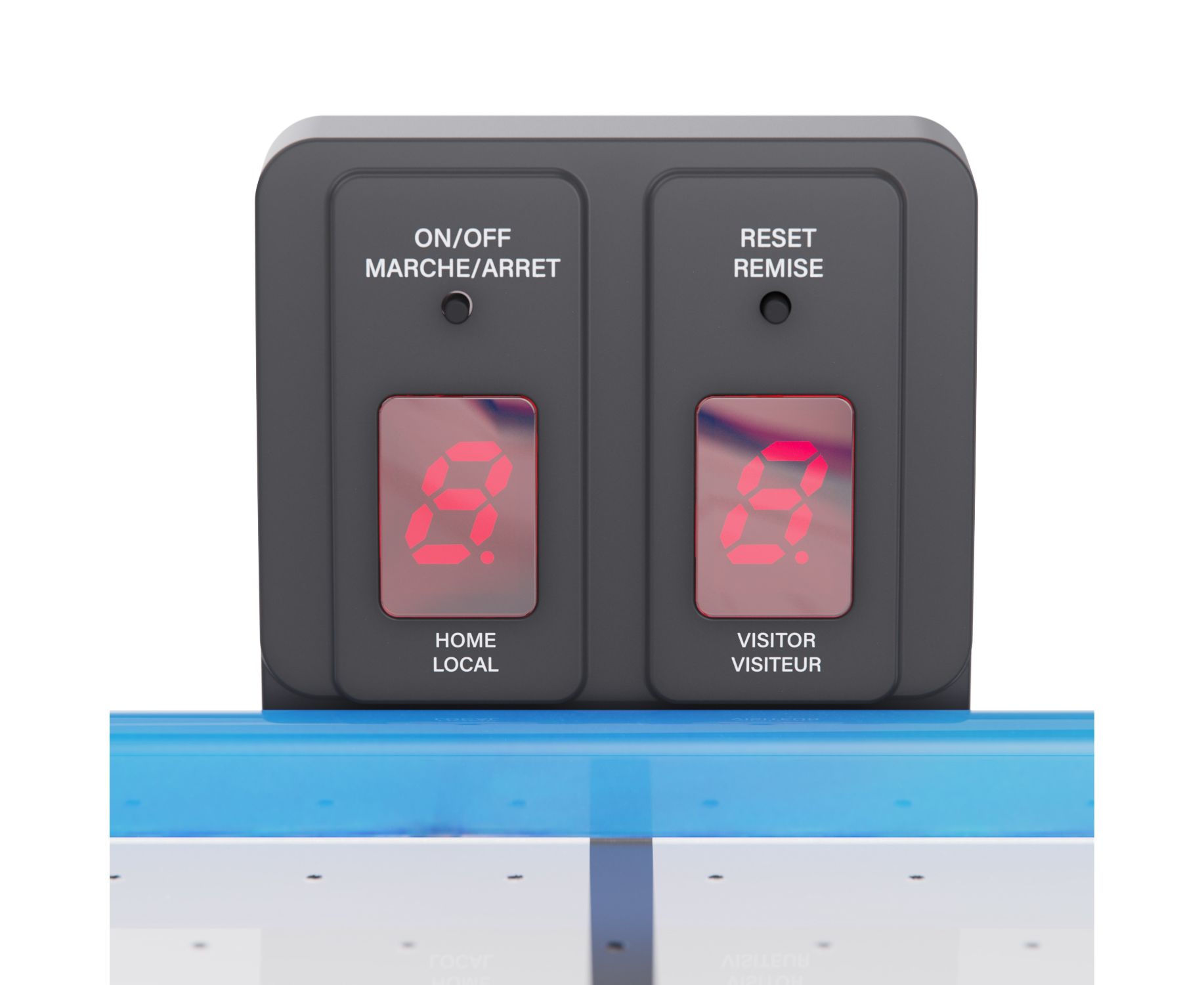 - Аэрохоккей оснащён мощным вентилятором, работающим от сети 220 В, который создаёт равномерный воздушный поток по поверхности стола. За счёт этого шайба легко и быстро скользит по полю, обеспечивая максимальную динамику игры и реалистичный эффект настоящего хоккейного матча.