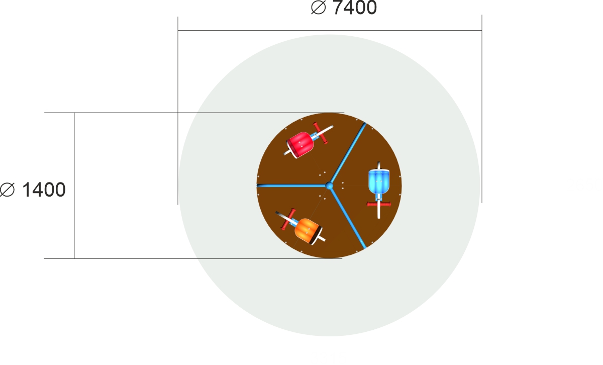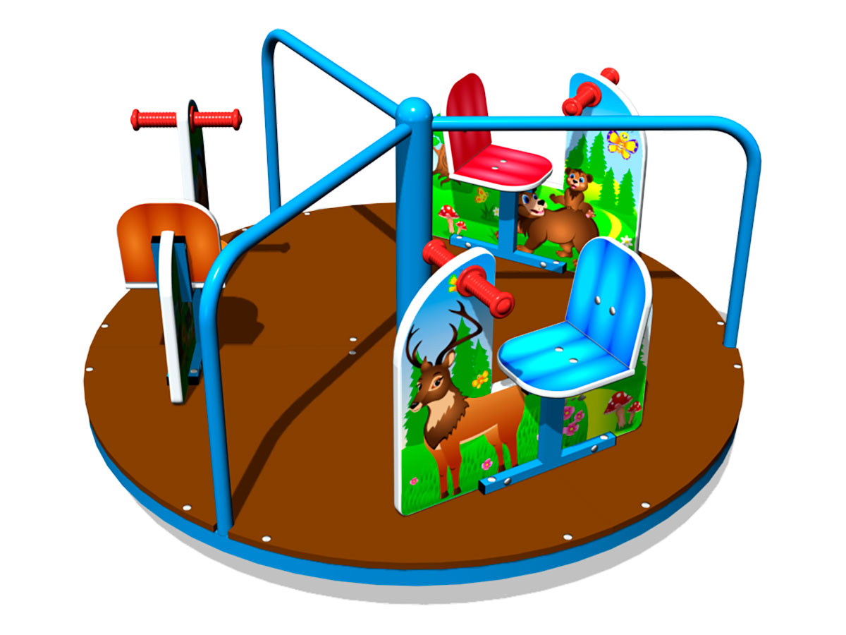 Детская карусель Лесной мир выполнена в виде трех отдельных посадочных мест, установленных на платформе. Каждое место оборудовано спинкой. Посадка ребенка на сидение осуществляется верхом. Изображения на сидениях нанесены при помощи УФ печати. Сидения отделены друг от друга металлическими поручнями. Изделие оборудовано разборным узлом вращения на двух подшипниках.