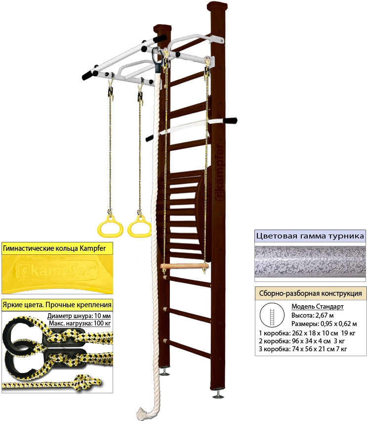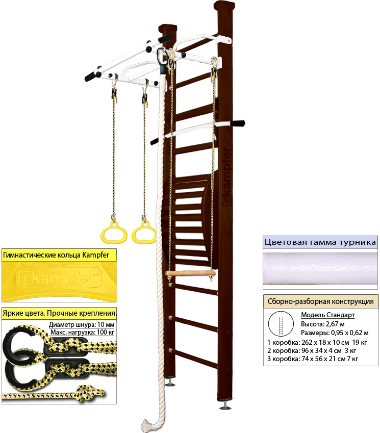 Детский спортивный комплекс ДСК Kampfer Helena Maxi Ceiling Высота Стандарт - это дополненная версия одной из самых популярных моделей из линейки деревянных ДСК Kampfer. Распорная шведская стенка Helena Maxi теперь в новой цветовой гамме, что позволяет подобрать нужный оттенок под дизайн помещения. Модель Kampfer Helena Maxi Ceiling включает в себя набор из самых популярных навесных аксессуаров канат, кольца и трапецию, а также тренажер для спины Kampfer Posture Wall. Конструкция домашнего спортивного комплекса Kampfer Helena Maxi Ceiling Высота Стандарт выполнена из натурального дерева, все края деталей немного скруглены обеспечивая большую безопасность для ребенка.