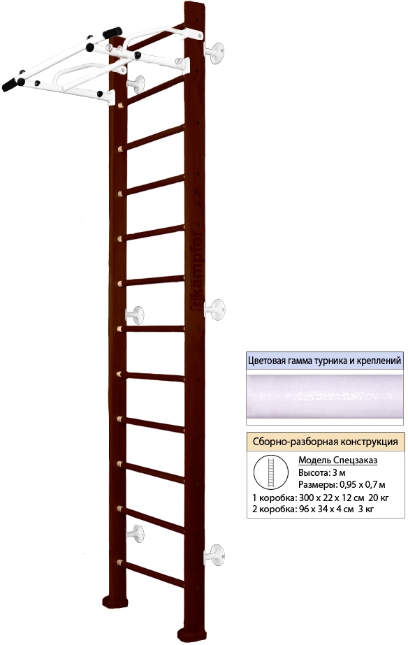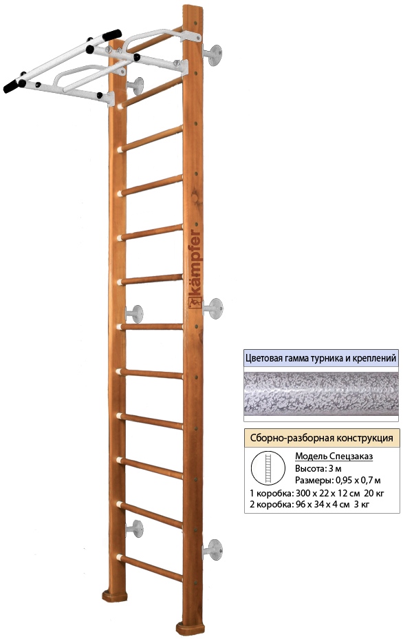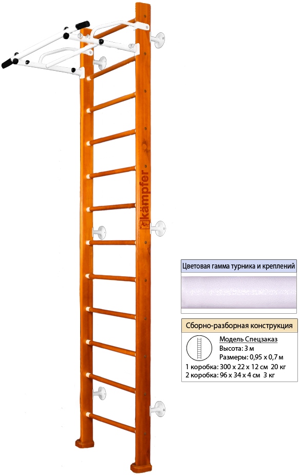 Конструкция домашнего спортивного комплекса Kampfer Swedish Wall высота 3м выполнена из натурального дерева, все края деталей немного скруглены обеспечивая большую безопасность для ребенка. Способ установки пристенный - крепится к стене. Универсальный и надежный вариант крепления. Можно использовать для помещений с подвесными и натяжными потолками. Не подходит при хрупких и гипсокартонных стенах, для них лучше подойдут модели с креплением враспор.