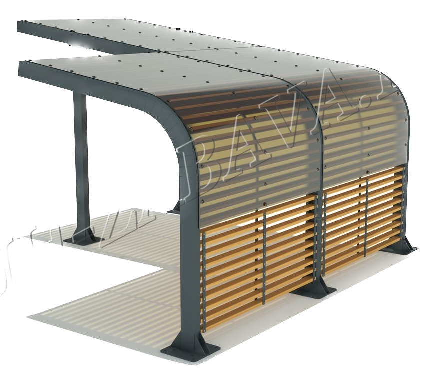 - Ограждение и навес выполнены из планкена (массив хвойных пород). Для защиты от осадков навес покрыт монолитным поликарбонатом толщиной не менее 6мм.