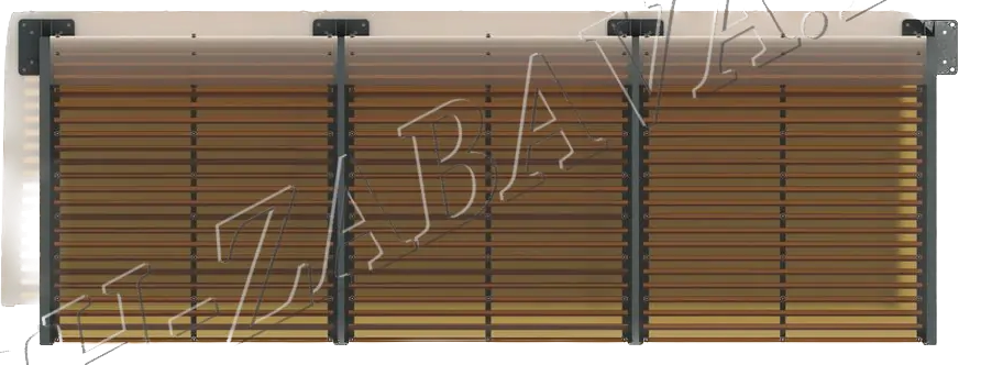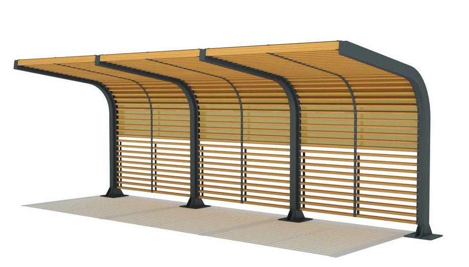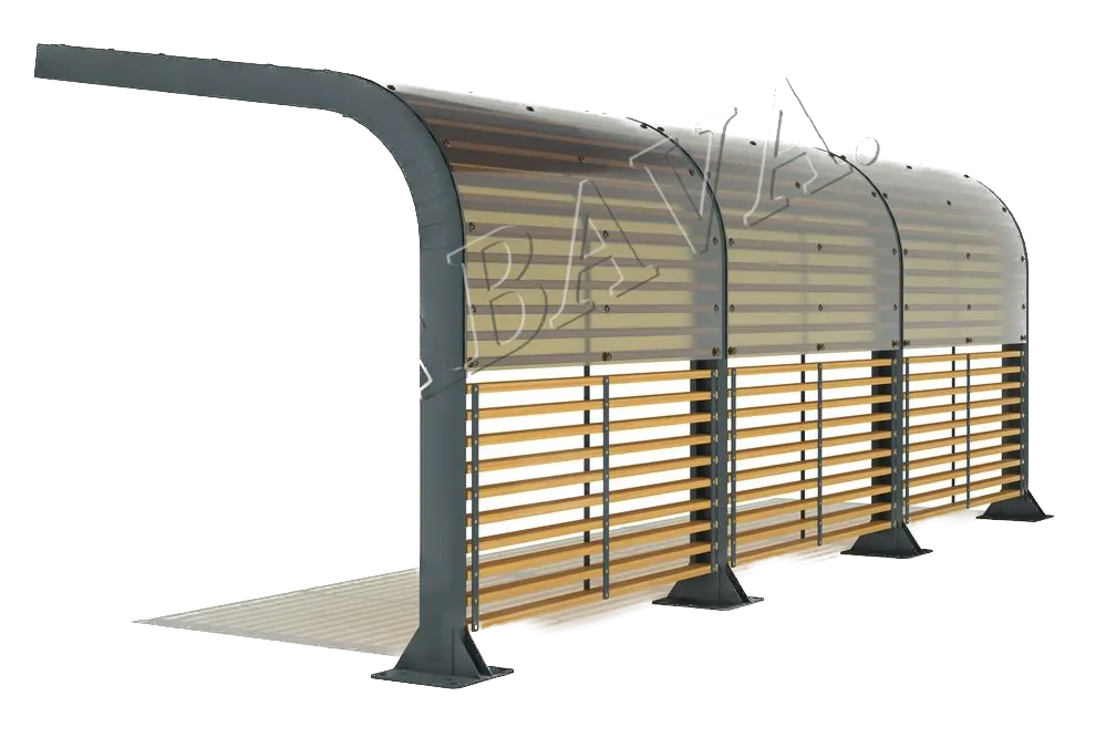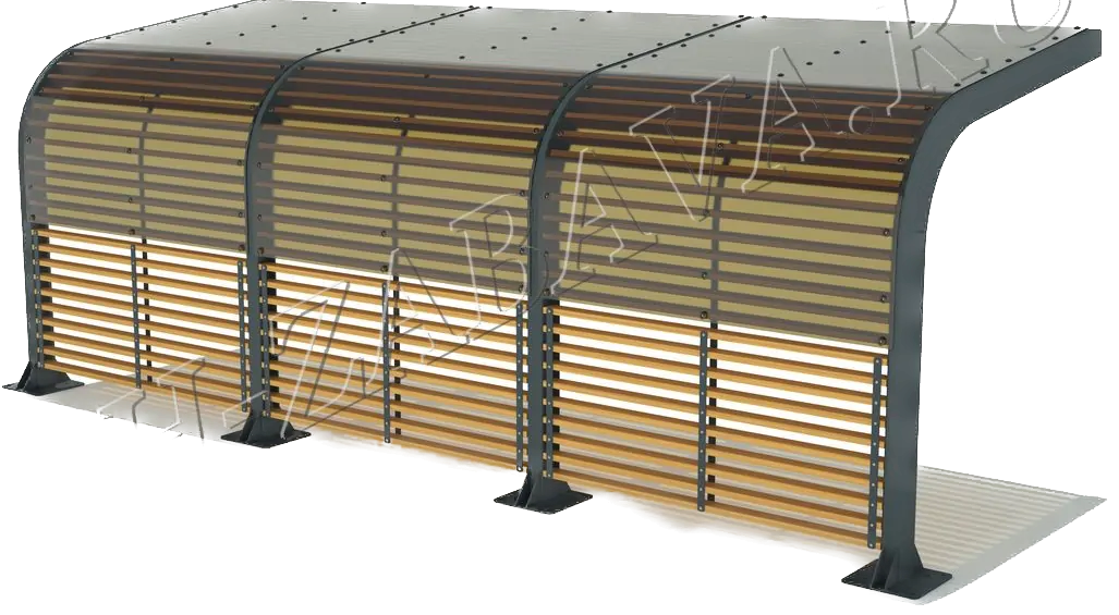 - Ограждение и навес выполнены из планкена (массив хвойных пород). Для защиты от осадков навес покрыт монолитным поликарбонатом толщиной не менее 6мм.