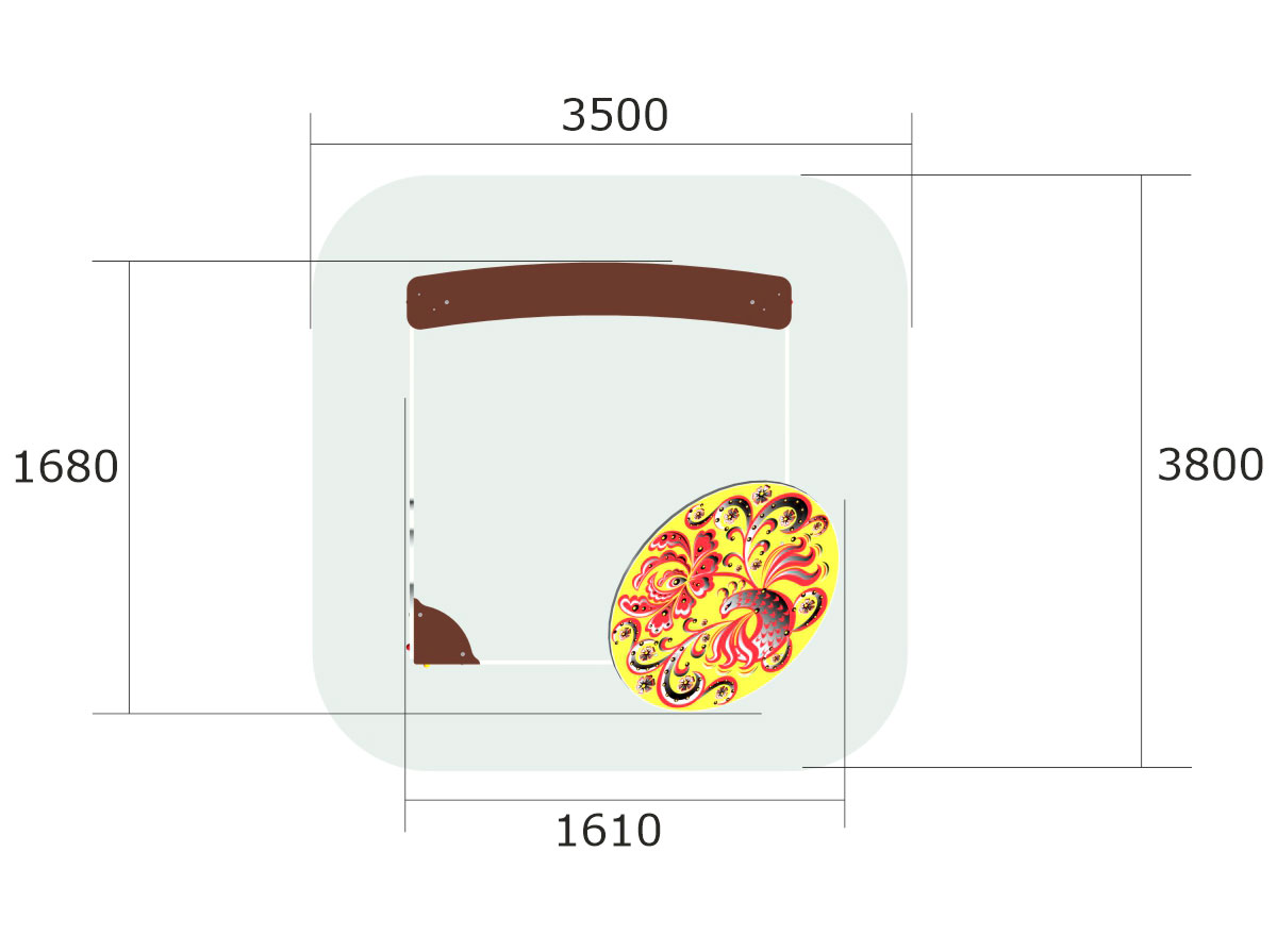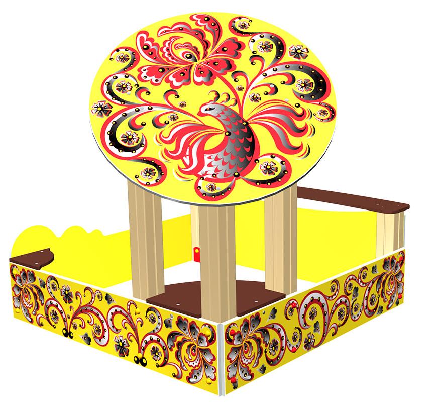 Песочница с крышей имеет размеры достаточные для комплектации стандартной детской игровой площадки. Небольшая крыша позволяет малышам укрыться в тени в самые жаркие часы летнего дня. Крыша и борта песочницы украшены изображениями под хохломскую роспись популяризуя этот русский народный стиль среди детей.