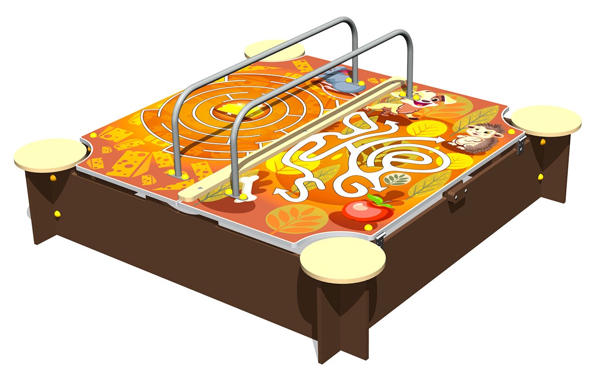 Песочница с откидной крышкой по всем параметрам соответствует СанПиН 2.4.1.3049-13. Крышки этой детской песочницы удобно откидываются, превращаясь в столики, а ручка крышки служит одновременно и ножкой-опорой. На деревянных крышках песочницы при помощи УФ печати нанесен лабиринт, на котором дети могут играть с машинками и другими игрушками. Столики окрашены водными красками.