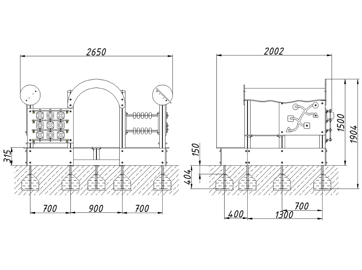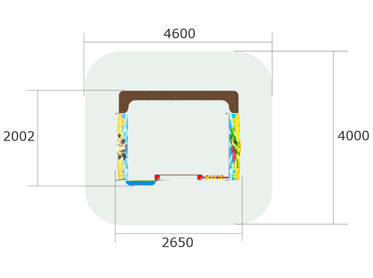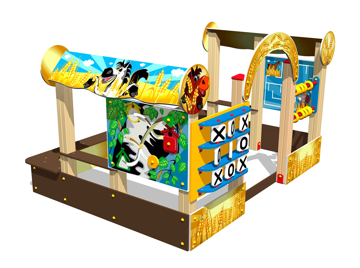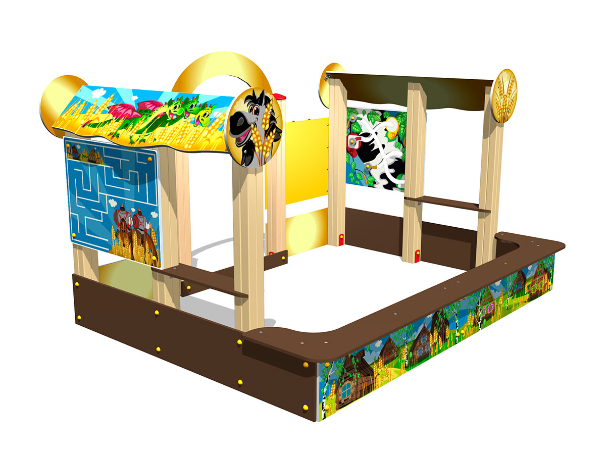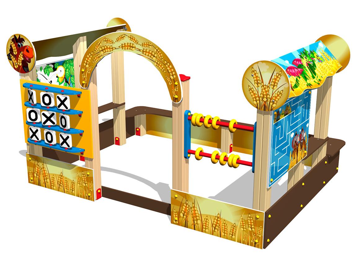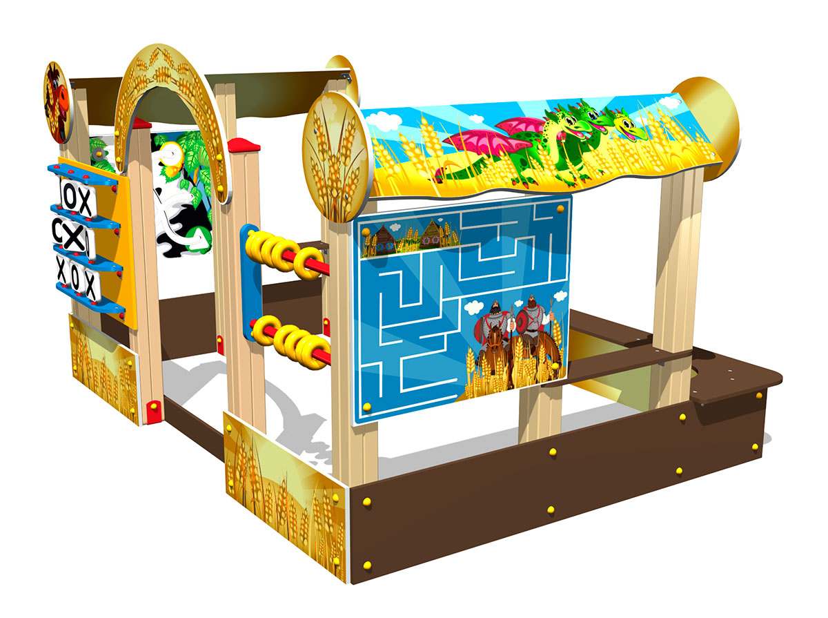 Песочный дворик имеет размеры достаточные, чтобы стать своеобразным центром средней по размеру детской площадки. В состав его входят счеты, игровая панель Лабиринт, игровая панель Крестики-Нолики, и пара высоких полочек для игры в куличики. Три крыши на панелями закреплены на двух столбах каждая и украшены рисунками на соответствующую названию тематику.
