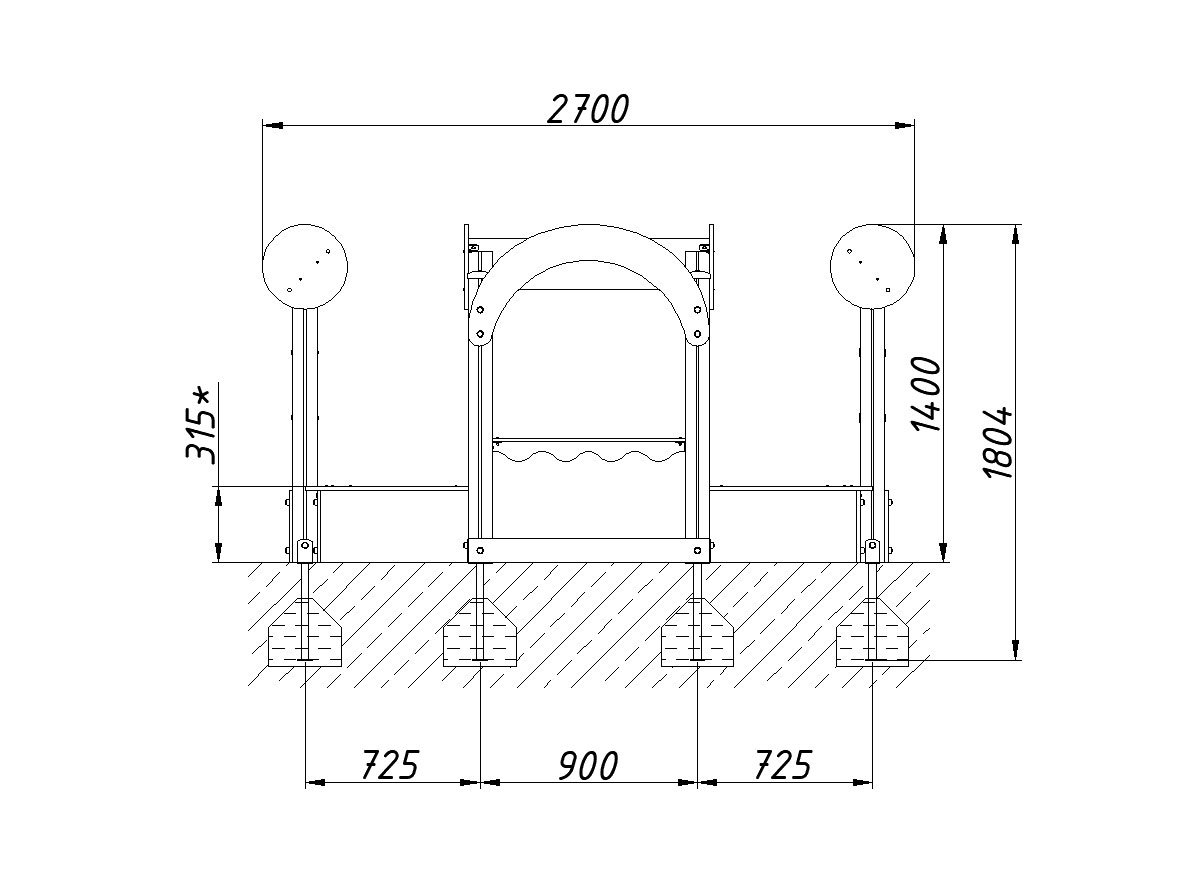 Элементы песочного дворика собираются между собой, после чего она бетонируется на глубину не менее 400 мм, таким образом, чтобы верх фундамента был выполнен на отметке -200 мм от уровня площадки. Оставшееся пространство ям после установки засыпается с уплотнением до поверхности земли.