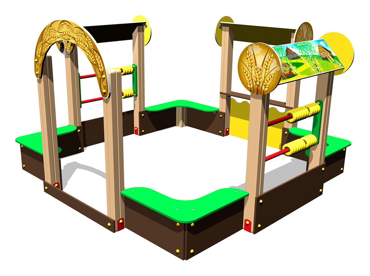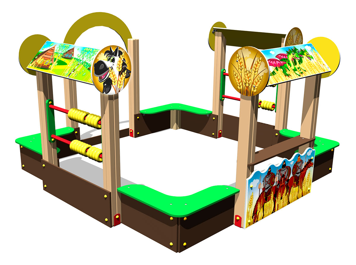 Песочный дворик имеет размеры достаточные, чтобы стать своеобразным центром небольшой детской площадки. В состав его входят двое счет, и высокая полочка по типу прилавка. Три маленьких крыши на ними закреплены на двух столбах каждая и украшены рисунками на тему русских былин.
