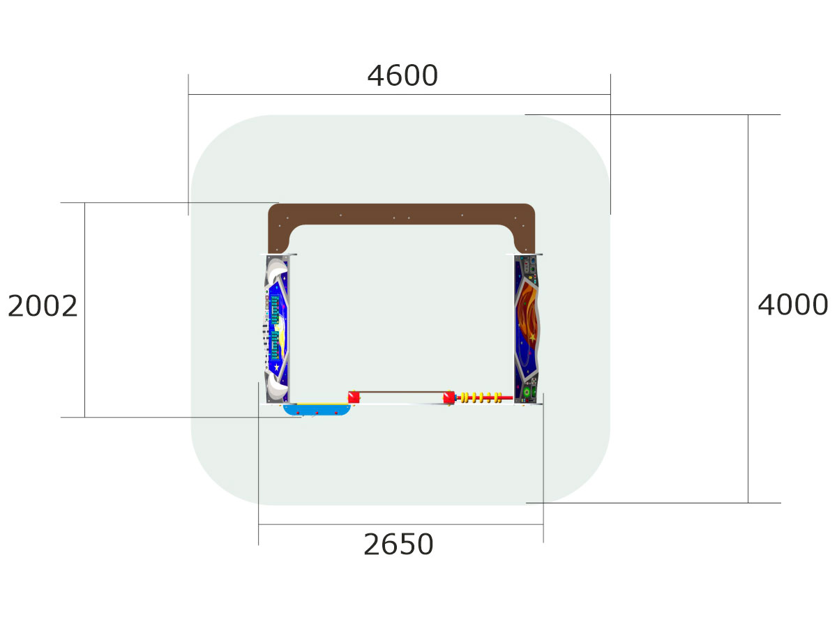 Песочный дворик имеет размеры достаточные, чтобы стать своеобразным центром средней по размеру детской площадки. В состав его входят счеты, игровая панель Лабиринт, игровая панель Крестики-Нолики, и пара высоких полочек для игры в куличики. Три крыши на панелями закреплены на двух столбах каждая и украшены рисунками на соответствующую названию тематику.