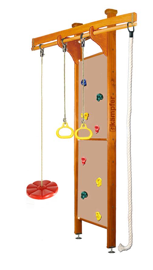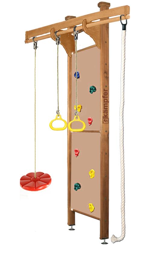 Спортивно-игровой комплекс Kampfer Swift Ceiling включает в себя скалолазную стенку на двух стойках и перекладиной для навесного оборудования и набор из самых популярных навесных аксессуаров канат, кольца, а также лиану.