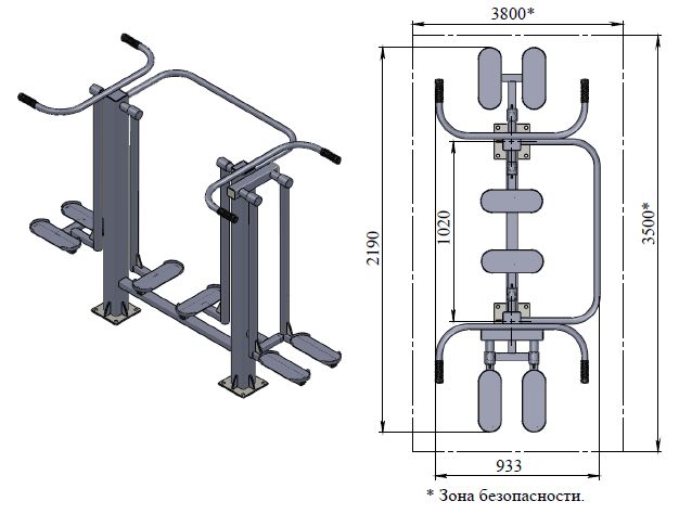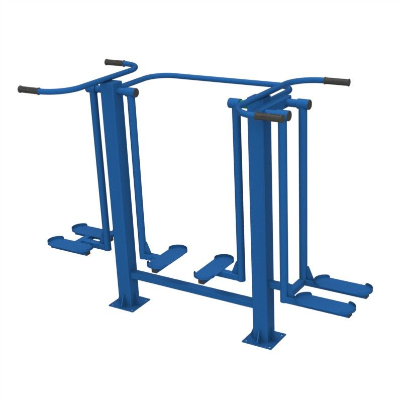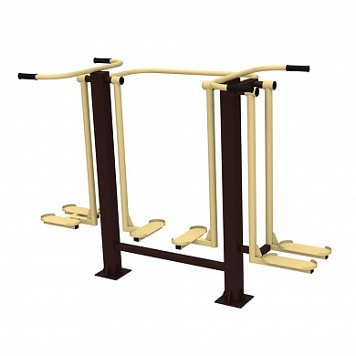 Многопозиционный спортивный уличный тренажер, включает в себя: шагоход, разведение ног, маятник.