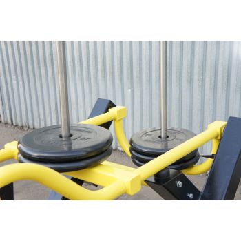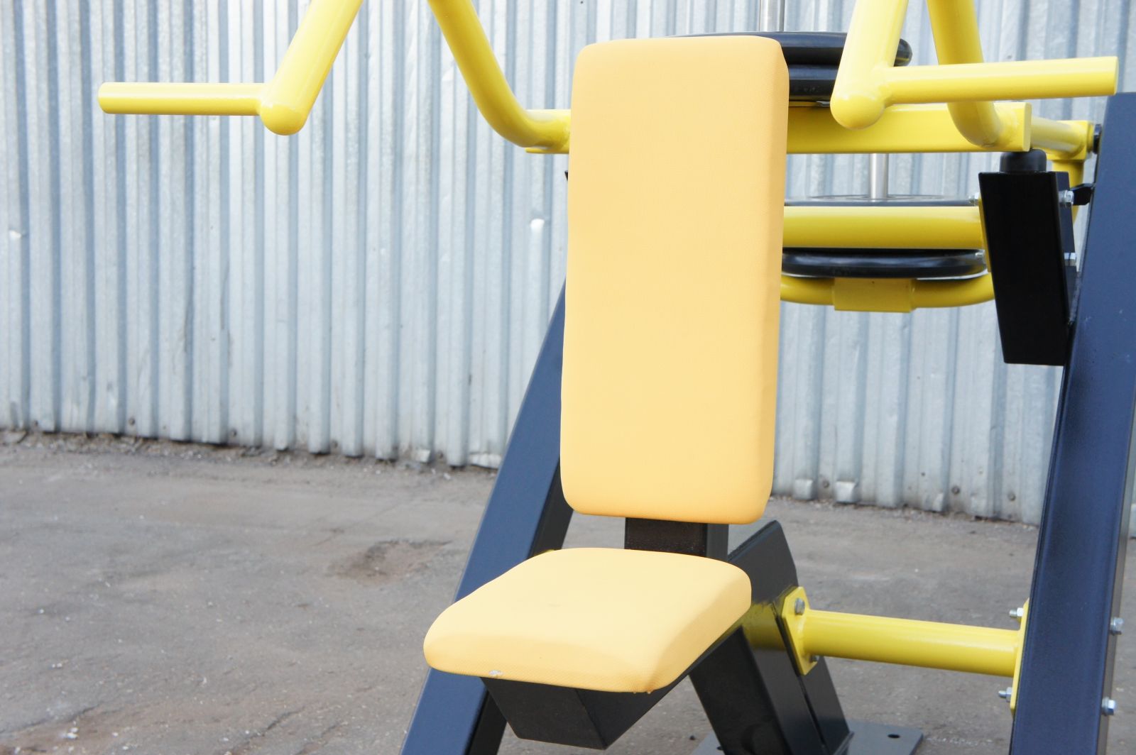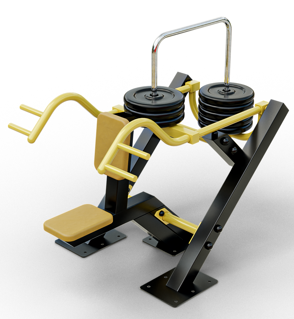 Уличный тренажер Жим вверх предназначен для проработки верхней части грудных мышц в положении сидя. Также активно работают трицепсы рук и дельты. Нагрузка регулируется при помощи перемещения дисков по направляющим.